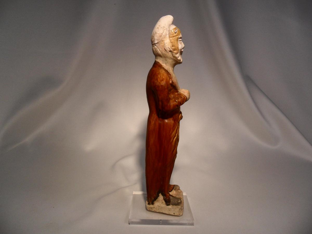 A very rare ancient Chinese Tang Dynasty terracotta standing male figure.This figure depicts a Foreigner Groom or Attendant, partially glazed in a rich red-brown. Wearing a traditionally long robe. These figures were frequently placed in the tombs to honor the dead. The naturalistic molding of his face is quite striking. His pronounced cheekbones might indicate a Turkish origin.